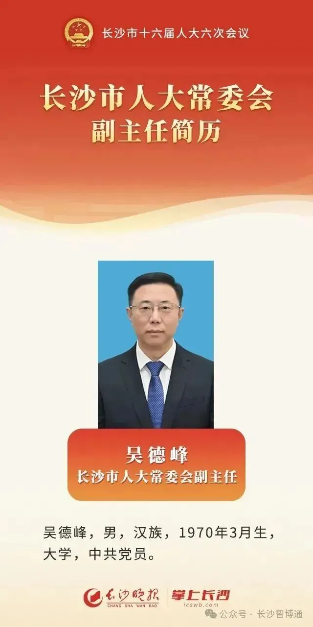 吴德峰,男,汉族,1970年3月生,大学,中共党员。1月9日上午,政协长沙市第十三届委员会第五次会议举行第二次大会。经过大会选举