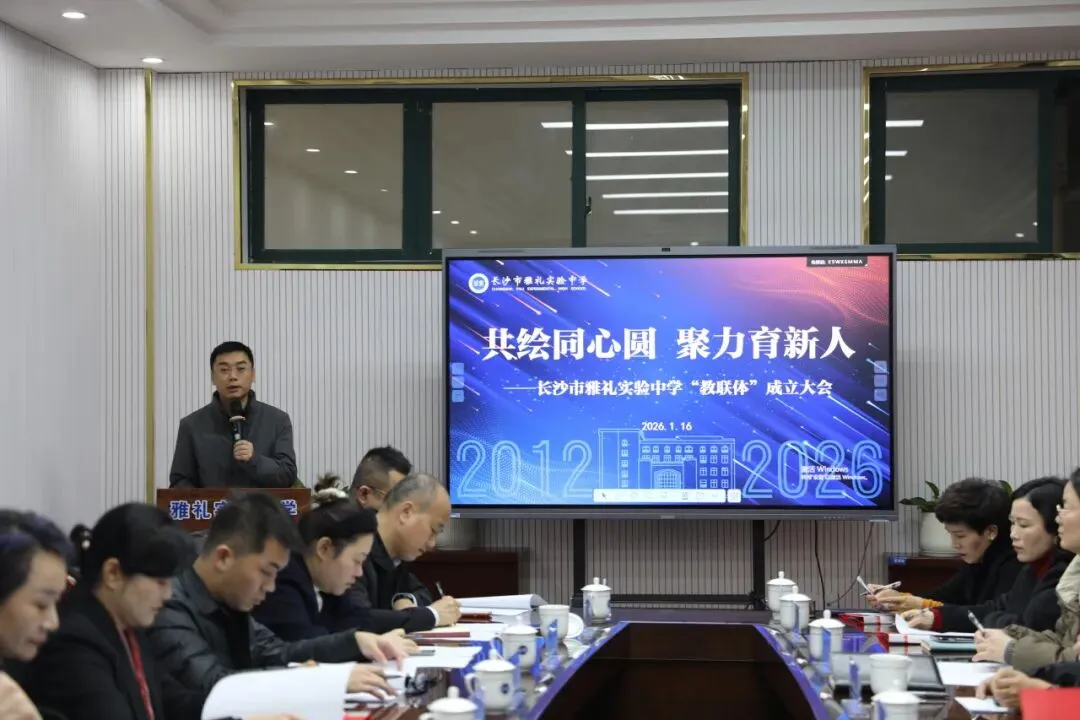 2026年1月16日14:30,长沙市雅礼实验中学教学楼318会议室群贤毕至、暖意融融,以“共绘同心圆,聚力育新人”为主题的教联体成立大会在此隆重召开。市教育局学生工作处副处长魏子钦,19家教联体成员单位代表、家长代表及学校领导、教师代表齐聚一堂,共同见证这一整合多方资源、推动区域教育高质量发展的重要会议。