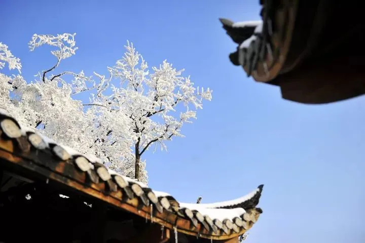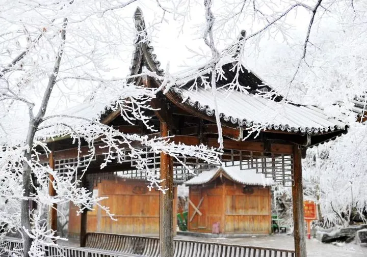 中式凉亭里的雾凇与廊檐