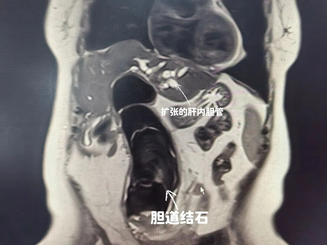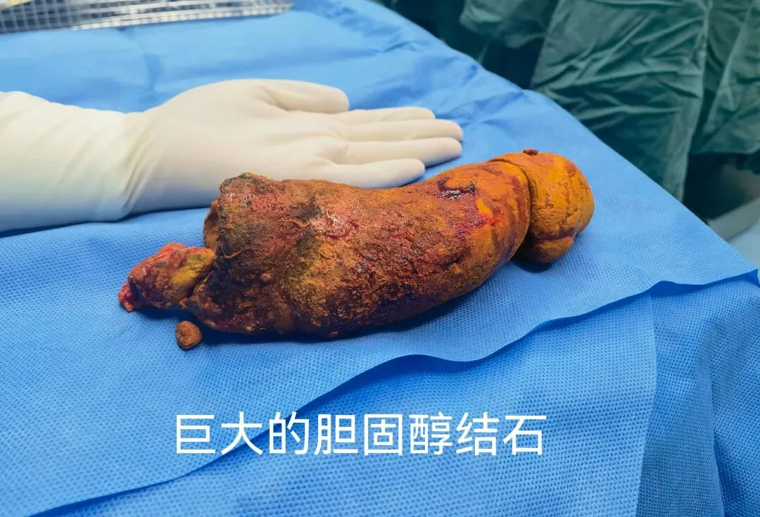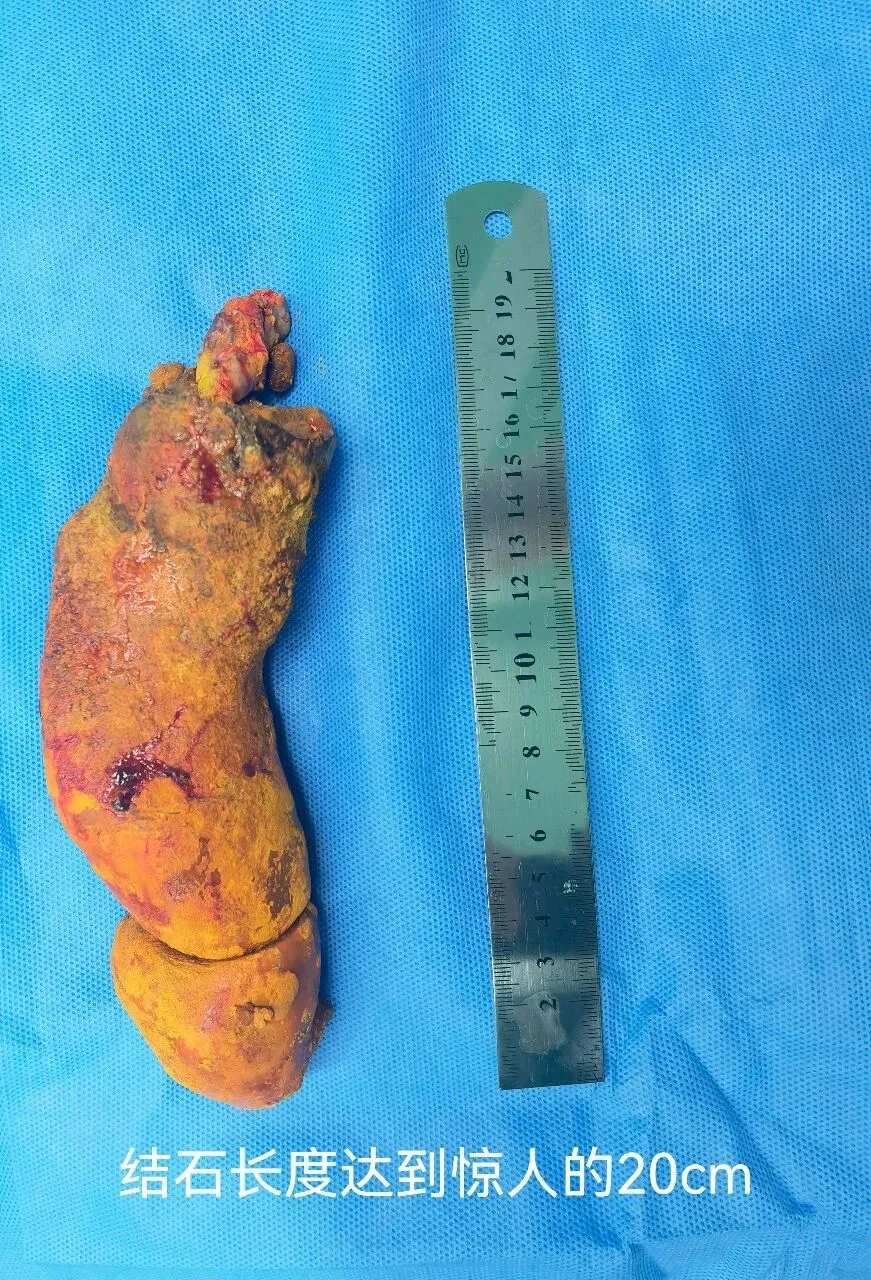 检查结果显示,在杨奶奶的腹腔里,竟然“藏”着一个惊人的大家伙——一颗长度达到20厘米的巨型结石。怎么形容呢?差不多有成人前臂那么长。它从肝内胆管里“长”出来,穿过早年手术搭建的“通道”(胆管空肠吻合口),一路“钻”到了空肠的深处。这还不算完,肝内和胆总管里,还有不少“小石头”散落着。