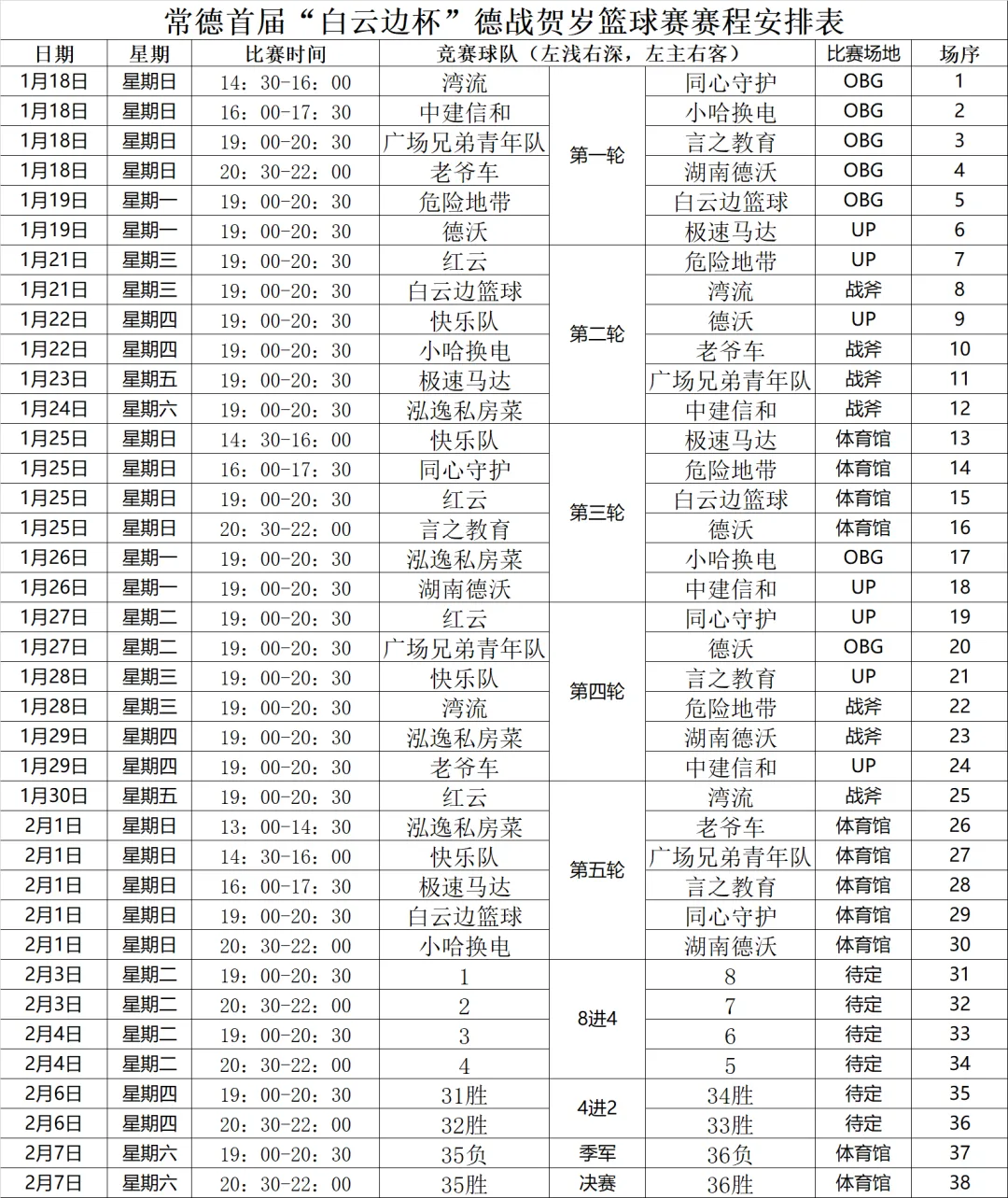 >常德首届“白云边杯”德战贺岁篮球赛赛程表