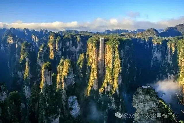 百龙天梯将张家界国家森林公园内的金鞭溪、袁家界、天子山等主要景区连成了一体。从金鞭溪大峡谷附近到袁家界,步行爬山耗时约2小时,在“水绕四门”乘坐天梯只需要2分钟即可到达。游客在乘坐电梯时,可以透过玻璃欣赏张家界一大绝景:神兵聚会。神兵聚会位于百龙天梯正对面,由几十座相对独立的石峰组成。