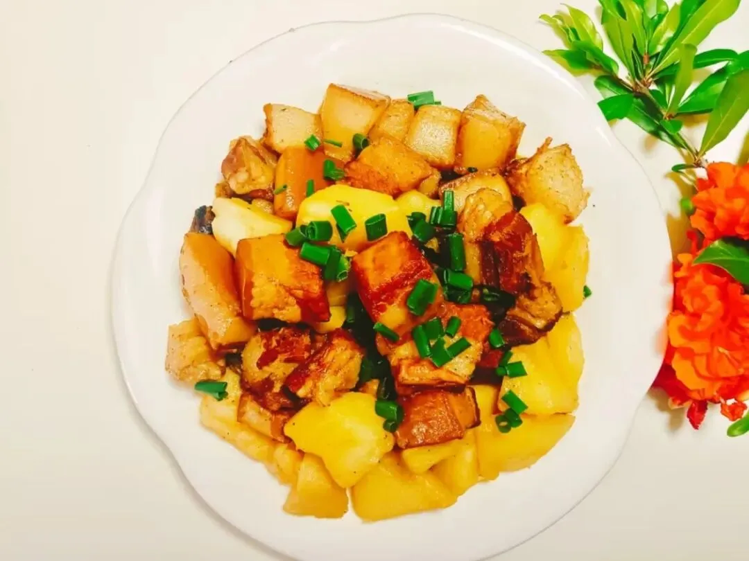 红烧肉烧土豆、黄豆芽炒肉末、手撕包菜、排骨海带汤、桃花香米饭