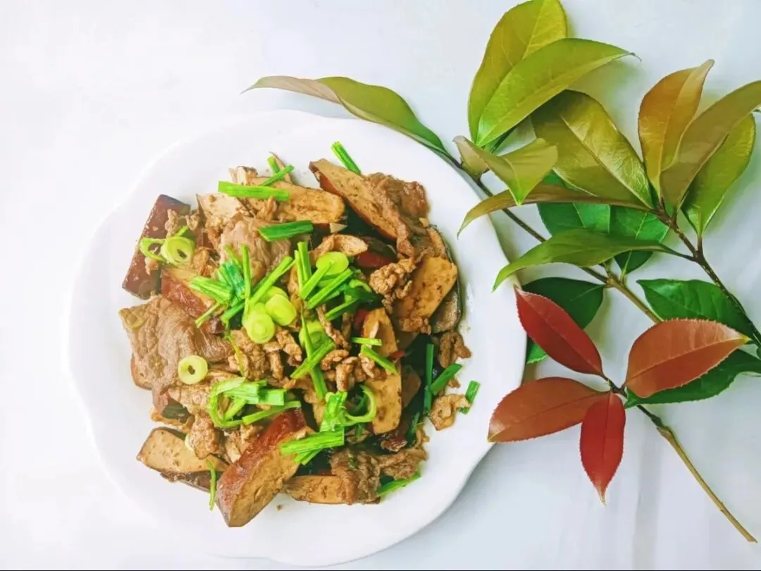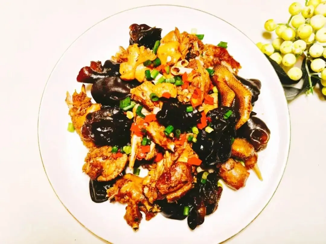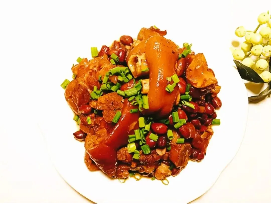 猪脚煨花生、香干炒肉、翠炒油麦菜、平菇筒子骨汤、桃花香米饭