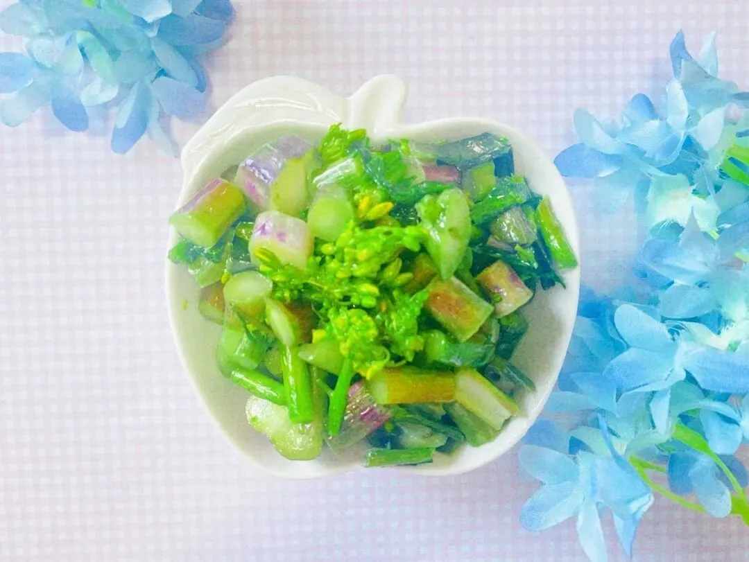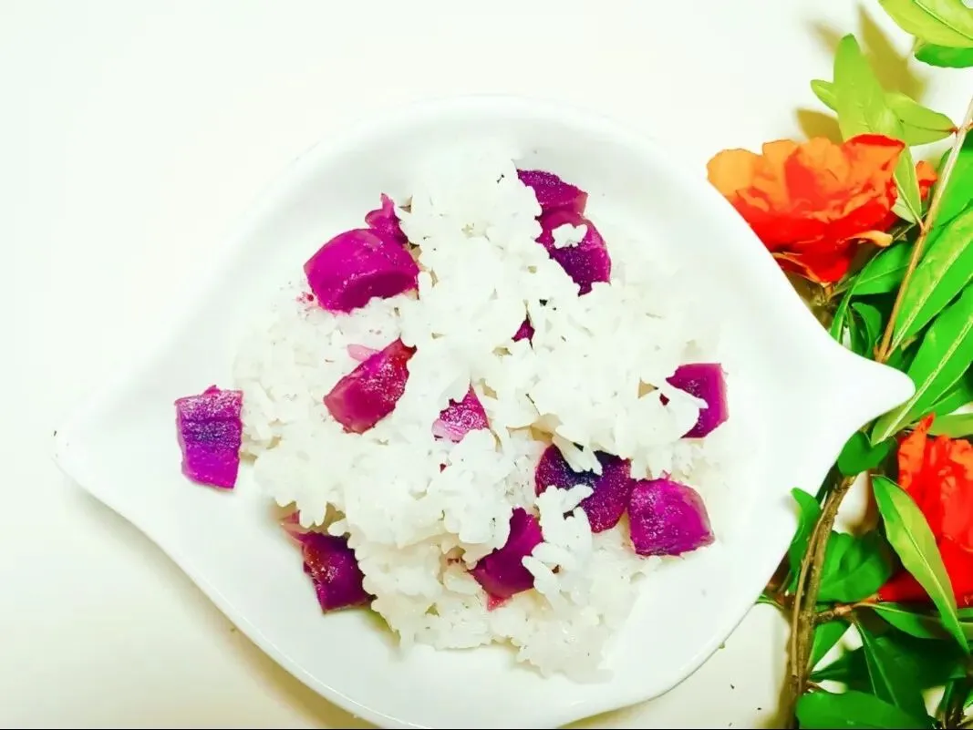 老鸭焖木耳、西红柿炒鸡蛋、清炒红菜苔、肉末米豆腐酸菜汤、紫薯桃花香米饭