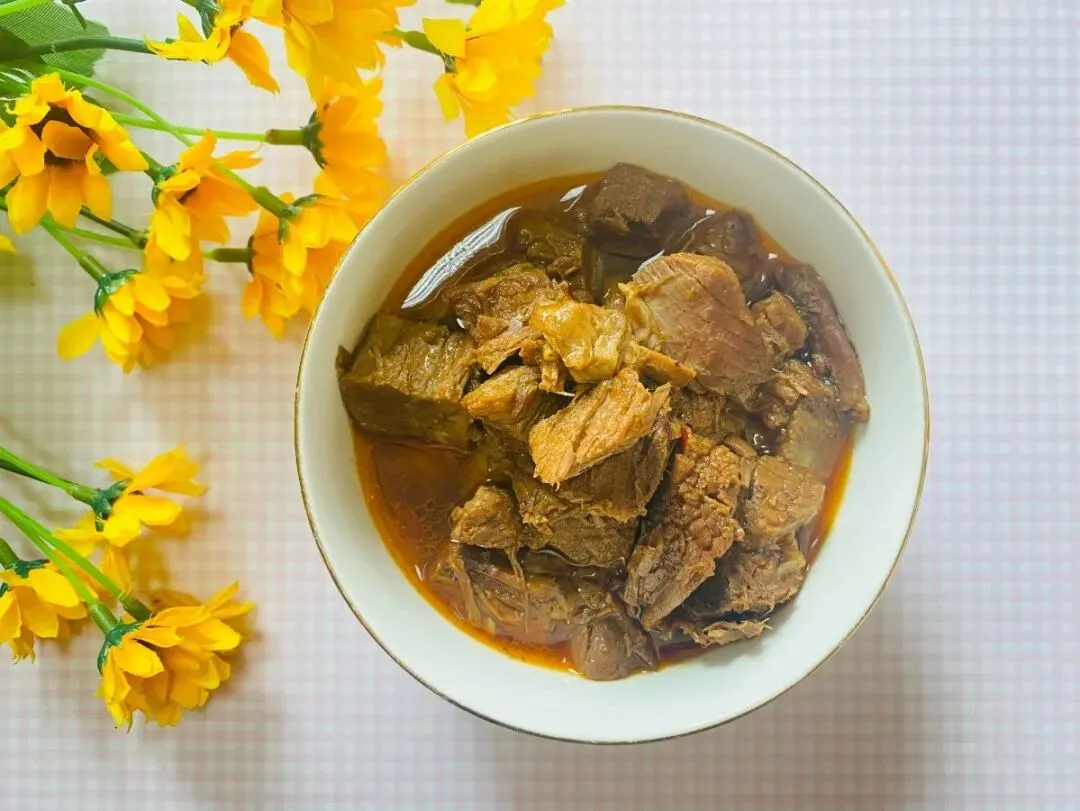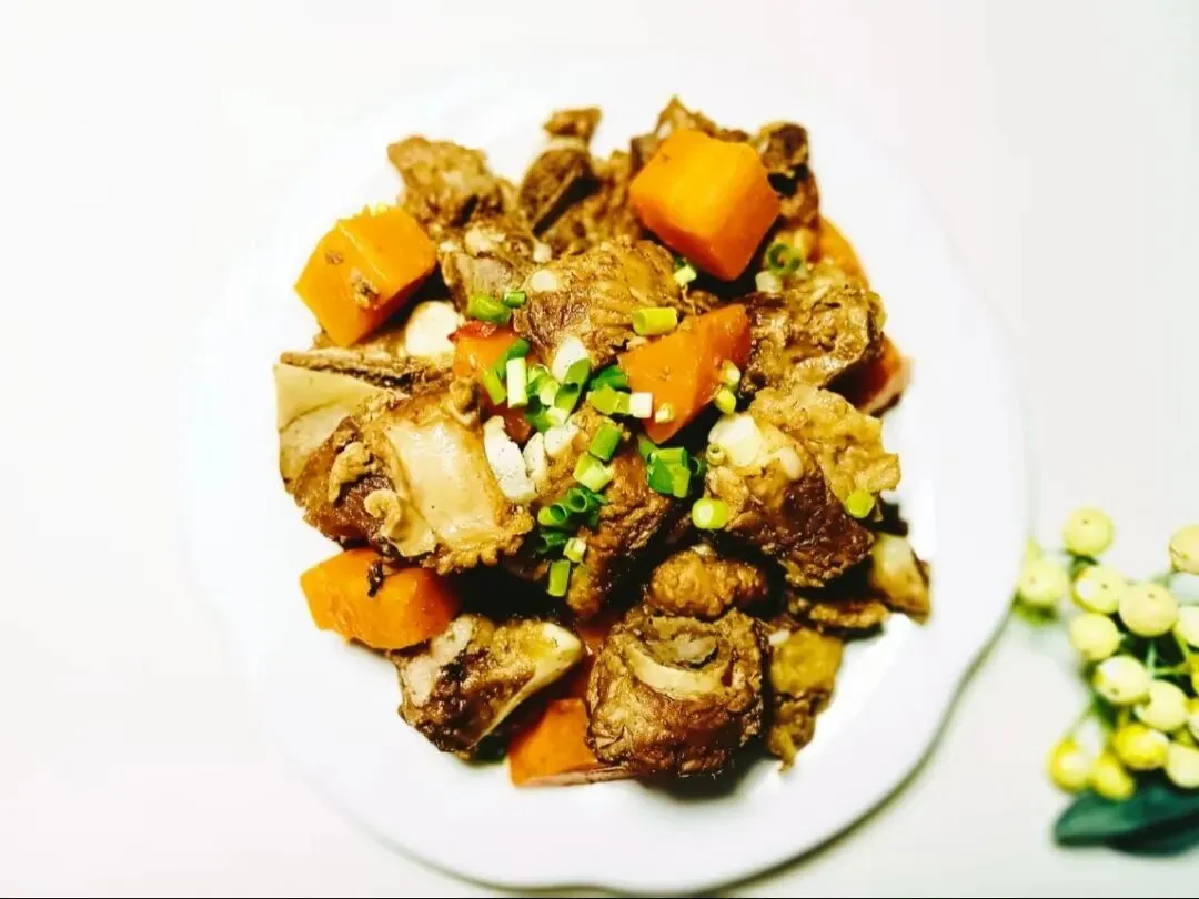 红烧牛腩、肉炒西兰花、清炒白菜苔、脊骨冬瓜汤、桃花香米饭