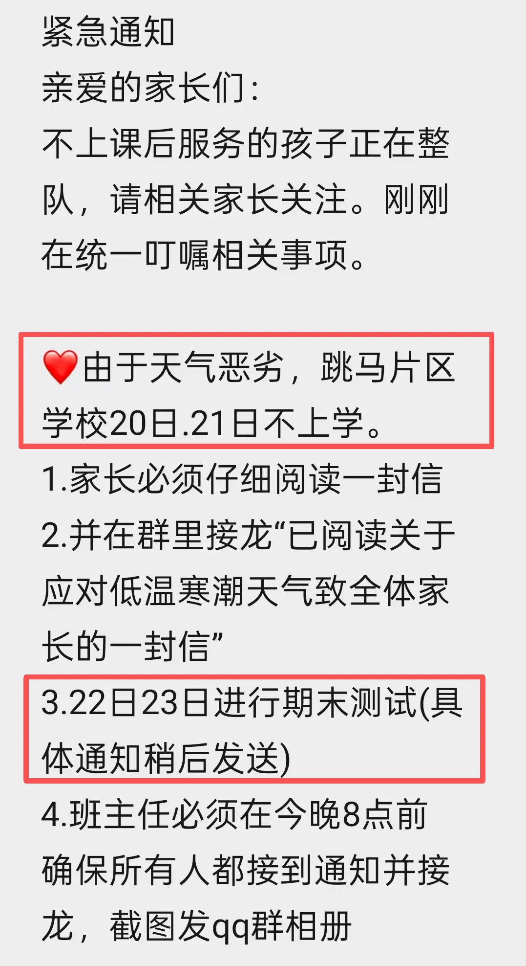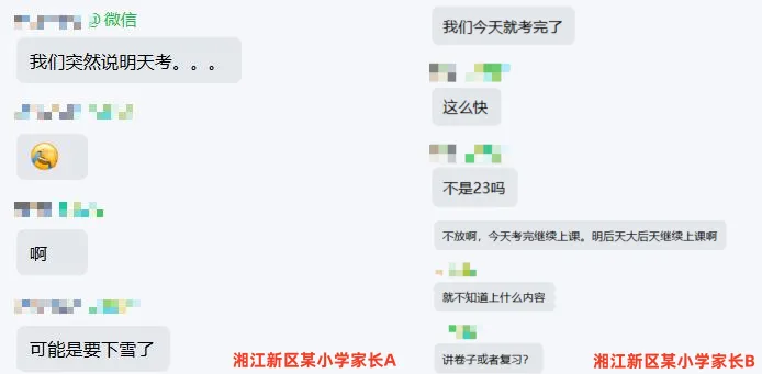 长沙大部分小学期末考试原本是定在1月22日和23日,一、二年级会稍微早一点。但为了应对即将到来的寒潮,据湘江新区部分小学家长反馈,学校突然通知小学期末考试提前至明天考;部分小学甚至已经在今天就组织了期末考试,但目前安排是考完不会立马放假,还需要回学校上课。