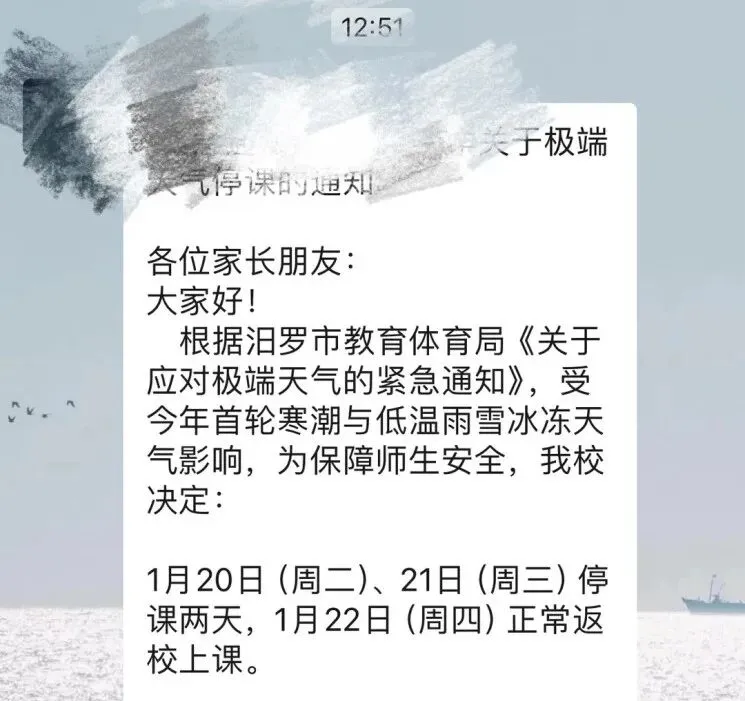 岳阳市汨罗市:受冰雪天气影响,1月20日、21日停课两天,22日正常返校上课。