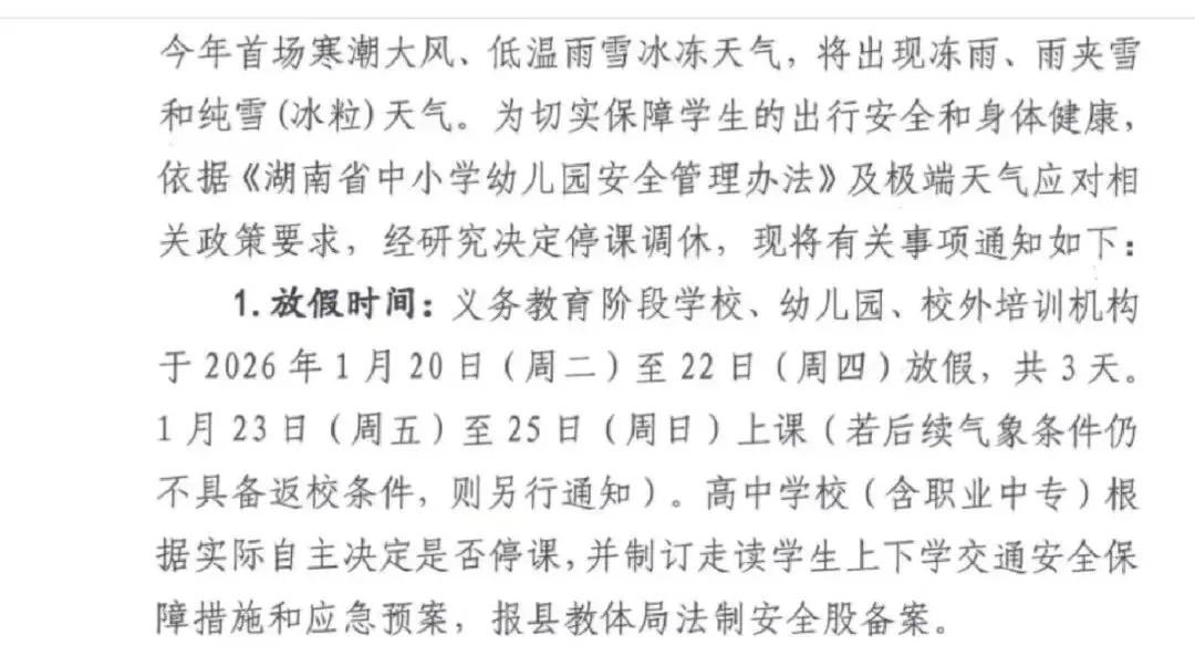 岳阳市华容县:义务教育阶段学校、幼儿园、校外培训机构1月20日-22日放假三天,若后续气象条件仍不具备返校条件,则返校时间另行通知。