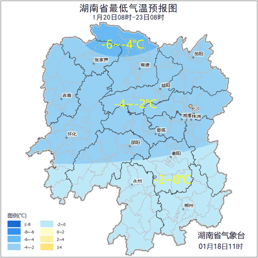 湖南省气象台1月19日7时升级发布寒潮橙色预警:预计19日8时至21日8时,湘西、湘中以南大部分地区平均气温或最低气温将下降12℃以上,已出现4-8℃降温的湘东北地区气温还将下降4-6℃,全省大部分地区最低气温低于0℃,并可能伴随5级以上偏北大风。