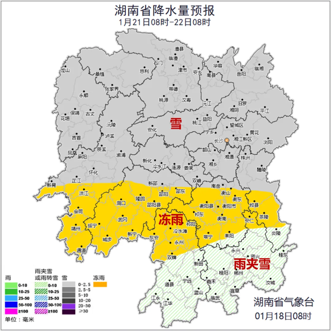 湘中以北有小雪或冻雨,其他地区有雨夹雪或冻雨;北风4~5级;最低气温-4~-1℃;最高气温-1~1℃。22日,湘中以南雨夹雪或小雪转多云,其他地区阴天到多云,过程趋于结束;北风2~3级;最低气温-4~-2℃;最高气温0~4℃。
