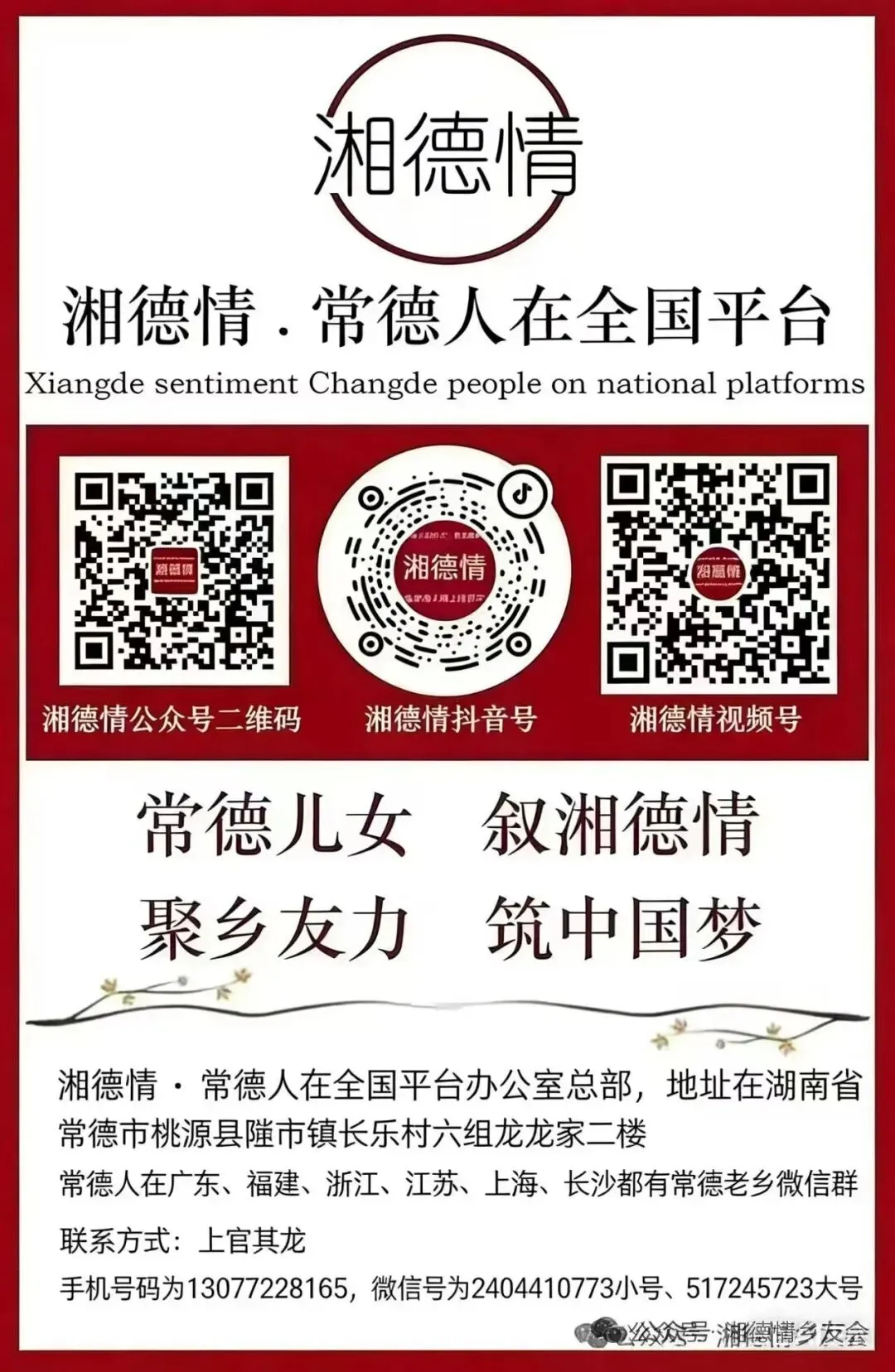 湘德情·常德人在全国平台办公室总部地址:在湖南省常德市桃源县陬市镇长乐村六组龙龙家.二楼联系方式:上官其龙 手机号码: 13077228165微信号:2404410773小号.微信号:517245723大号
