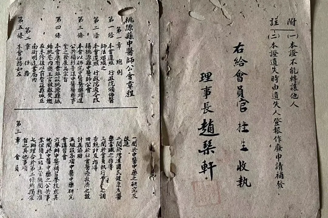 一份是常德大河街精强盐号商人陈高霖呈交法院的自述经济纠纷调解书;一份是桃源县中医师协会颁发给官桂生的会员证;还有一份是农户龙东安售卖土地立的地契。这三名身份各异的人提供的历史档案都共同指向日寇对常德和桃源所犯的累累罪行。