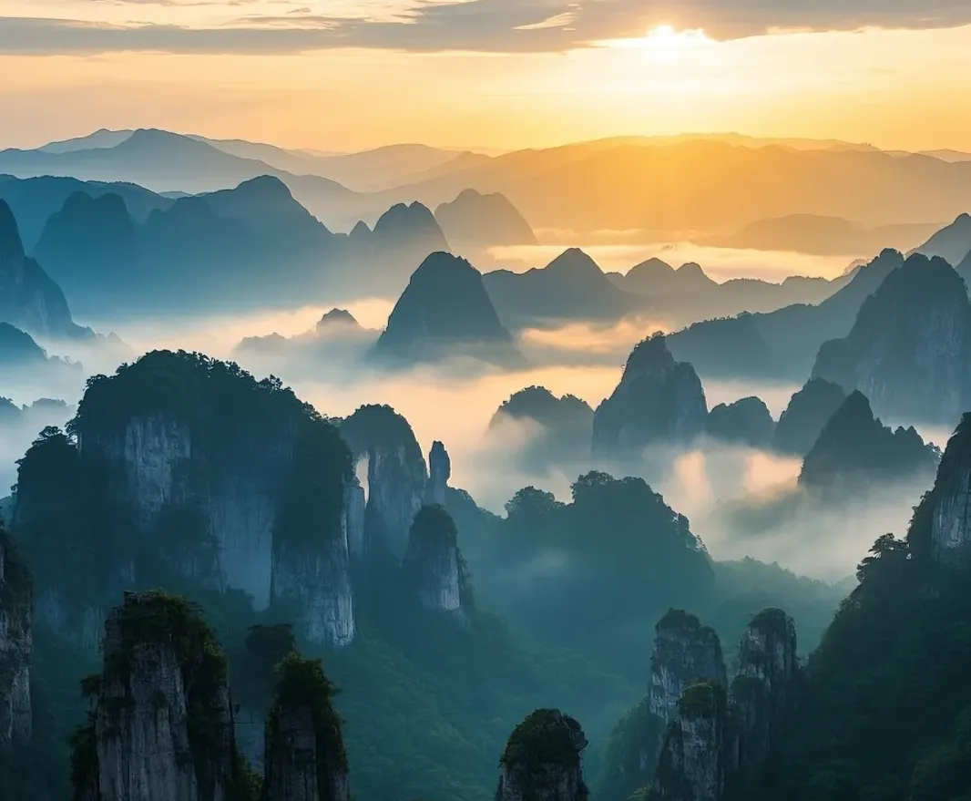 1992年,武陵源进了世界自然遗产,峰林像刀切一样立着,当地人叫石柱子,天晴看远,起雾像仙。