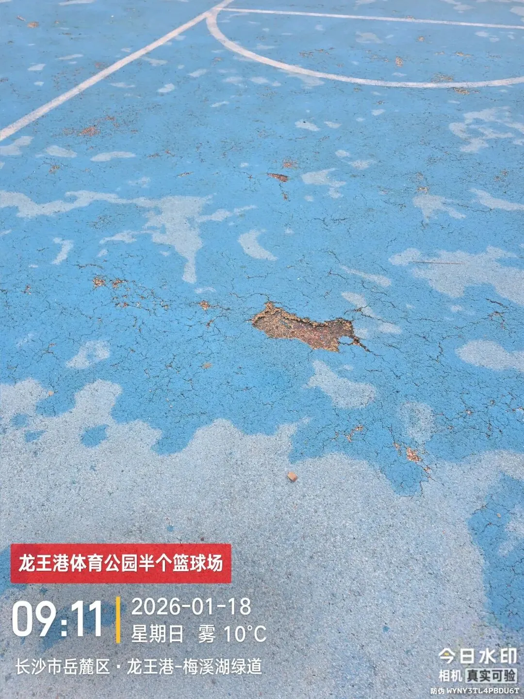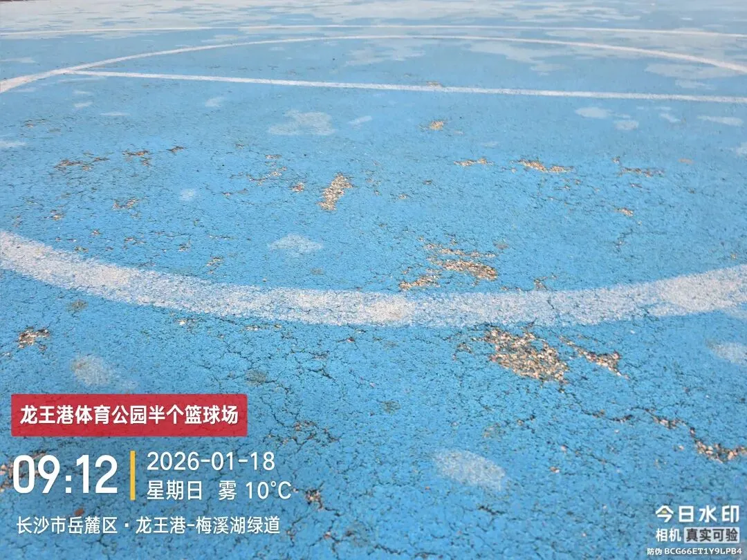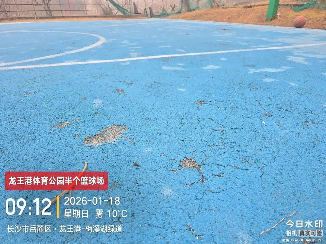 龙王港体育公园作为湘江新区重要的公共体育配套设施,本应是市民休闲运动、强身健体的优质场所,其建设与维护资金均来源于纳税人的血汗钱,理当符合国家相关质量标准,为市民提供安全、舒适的运动环境。根据行业普遍标准及公共体育场地设施建设相关规范,一般公共体育场地设施的质量保证年限为 5-8 年,这是保障设施正常使用、满足市民长期运动需求的基本要求。然而,该公园内的半个篮球场,自投入使用以来尚未满 2 年,却早在 1 年半以前就已出现严重损坏,如今整个球场区域更是惨不忍睹。