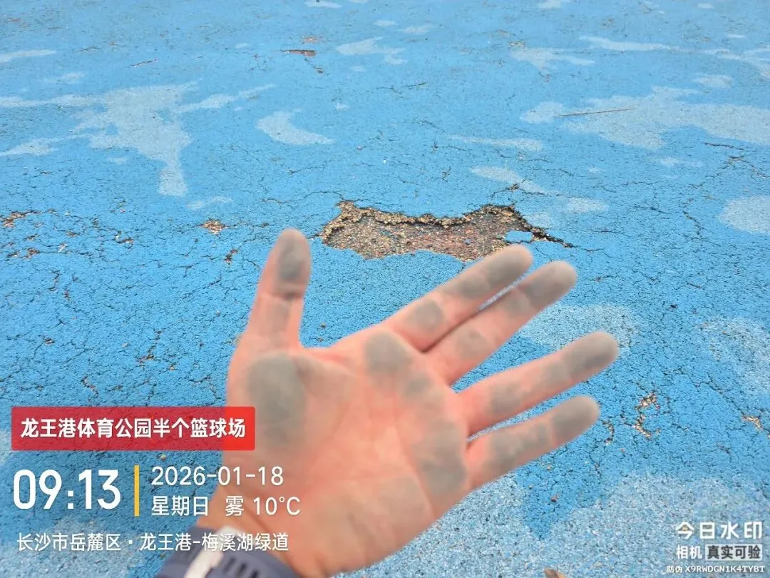 目前,该篮球场的地面已到处坑洼不平,球员在场上奔跑、跳跃时极易因地面高低落差而摔倒受伤,存在极大的安全隐患,严重威胁到市民的人身安全。更令人难以接受的是,球场地面的涂层质量极差,市民在打球过程中,双手会沾满地平上的蓝灰色污渍,不仅难以清洗,影响个人卫生,更让运动体验大打折扣。原本应是市民放松身心、享受运动乐趣的场所,如今却因设施质量问题让大家望而却步。