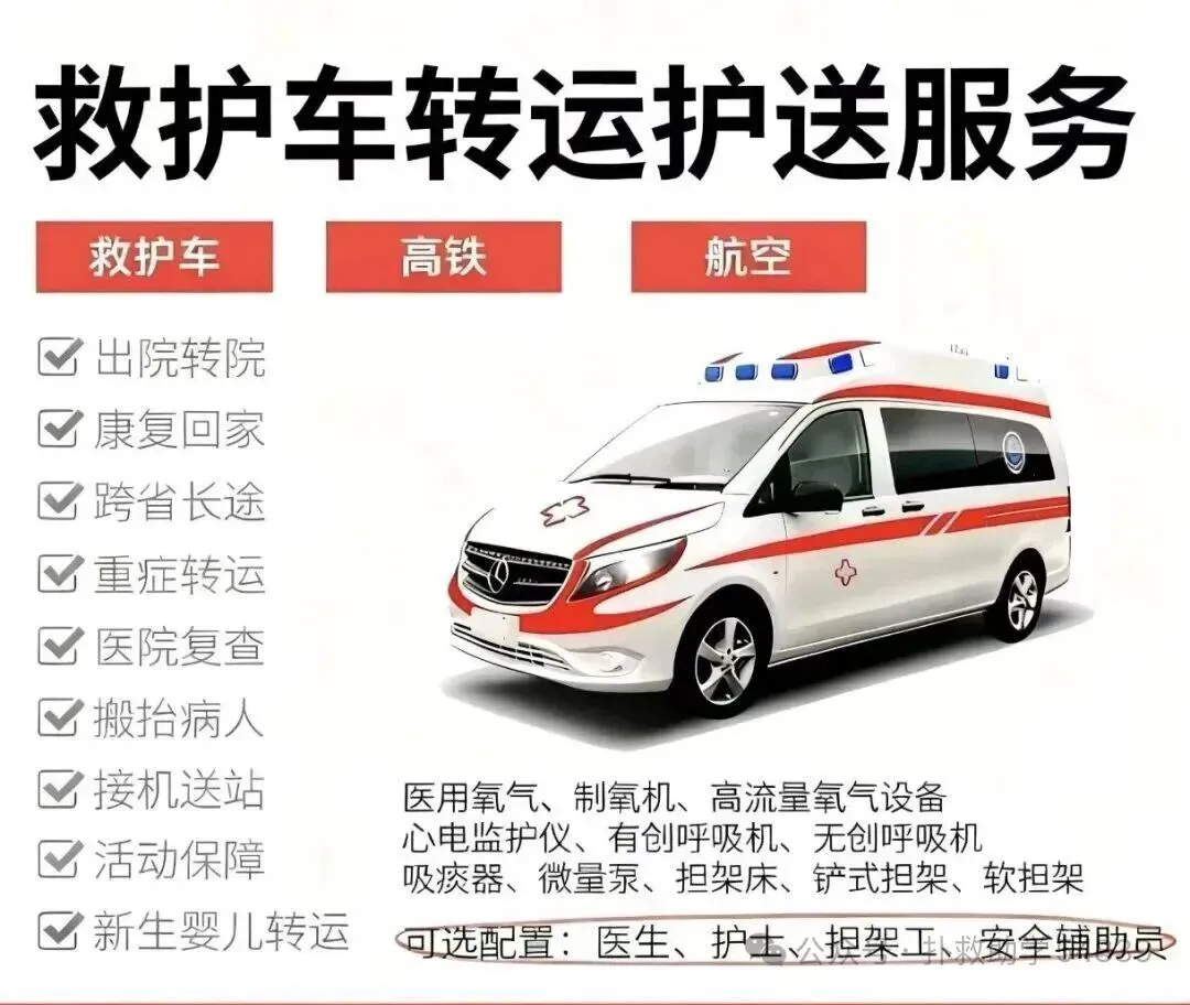 专业救护车出租转运,全程贴心守护,安全直达目的地!我们专注非急救医疗转运,不管是跨城转诊、出院护送,还是康复阶段转运,都能提供高效靠谱的解决方案,稳稳打通生命保障的“最后一公里”。