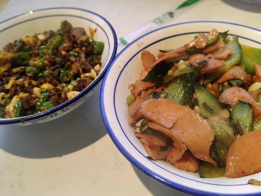 菜很快上桌,黄瓜炒火腿还冒着热气,拆骨肉炒荷包蛋还带有红辣椒,蛮韵味。我夹起一块黄瓜,顺带干起我的老本行:“Peter,这个是cucumber,黄瓜咯,脆蹦蹦的!” 小孩哥顺便夹着火腿:“Mum,火腿是ham!上次你教过我的,还记得呢!”