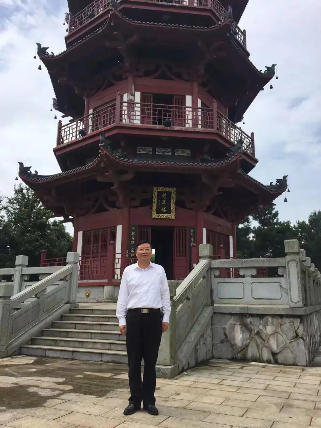 离开烟囱,循着青石板路前行不远,便是遗址的纪念塔——觉华塔。这座五层宝塔建于觉华山山巅,总高37.5米,飞檐翘角间透着唐代建筑的雄浑与雅致。拾级而上,塔身砖石温润,每一级台阶都仿佛镌刻着岁月的纹路。登顶远眺,湘江如一条碧绿的绸带蜿蜒东去,两岸田畴交错,村落点点,而脚下的遗址公园全貌尽收眼底——窑包错落有致地分布在山坡间,彩陶溪穿园而过,18座仿唐石桥横跨溪上,与远处的绿树青山构成一幅浑然天成的画卷。站在塔檐下,江风拂面,耳畔仿佛传来千年前商船起航的号子与瓷器交易的喧嚣。2017年的纪念塔尚未被过多游客踏访,登顶时唯有我与几位当地老人,他们指着远方的石渚湖,闲谈着“古岸陶为器”的往事,让这份登高望远的惬意中,更添了几分人文温度。倚着塔栏留影,身后是千年江景与唐风古塔,镜头里定格的不仅是风景,更是一段跨越时空的对话。