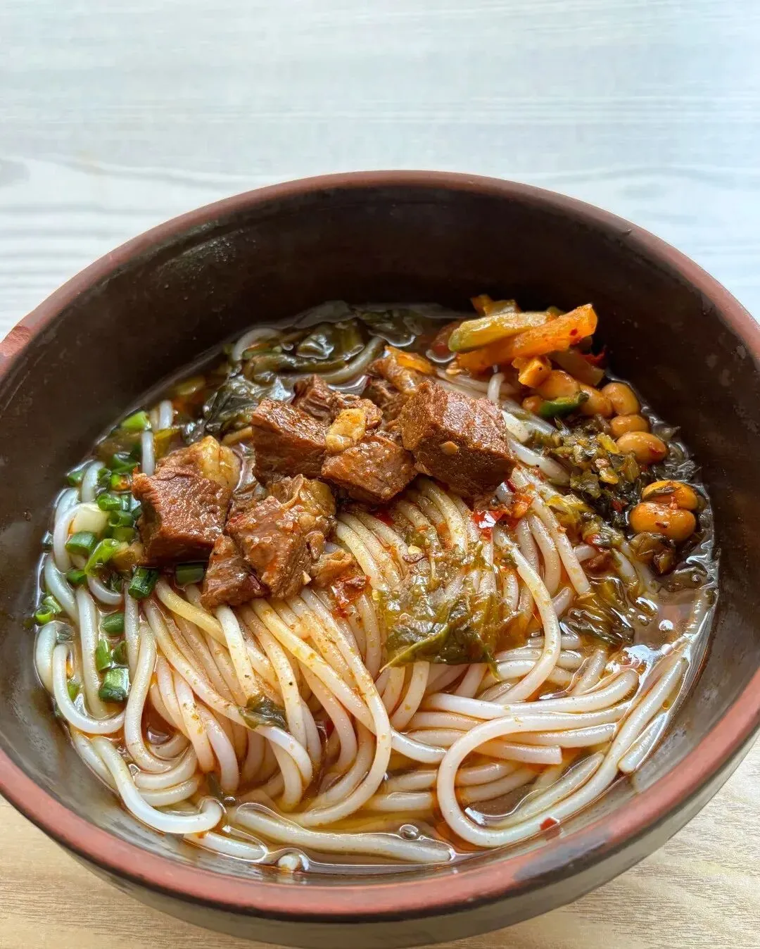 特色推介:常德牛肉粉这碗粉的灵魂,全在“浇头”上。牛油要厚,红油要亮。大块的牛肉经过几十种香料的慢炖,吸饱了汤汁。米粉在滚水里烫个十几秒,捞起,浇上一勺红油牛肉汤,撒把葱花。嗦一口,米粉的滑和牛肉的香在嘴里打架,那股子辣劲儿,是从喉咙口直接暖到胃里的