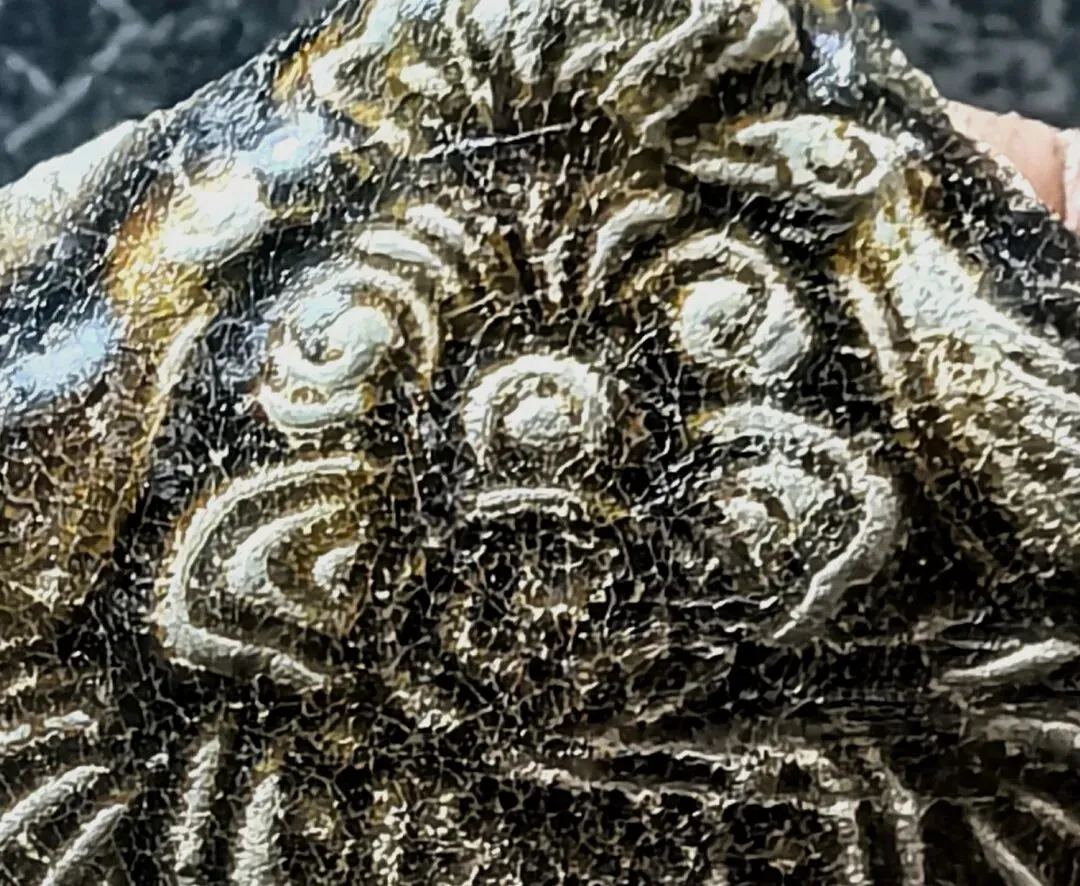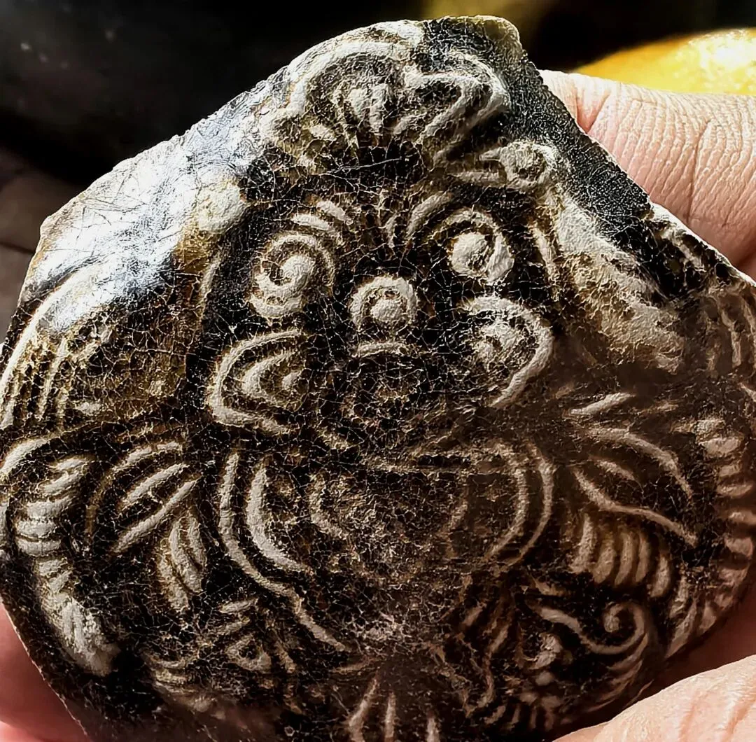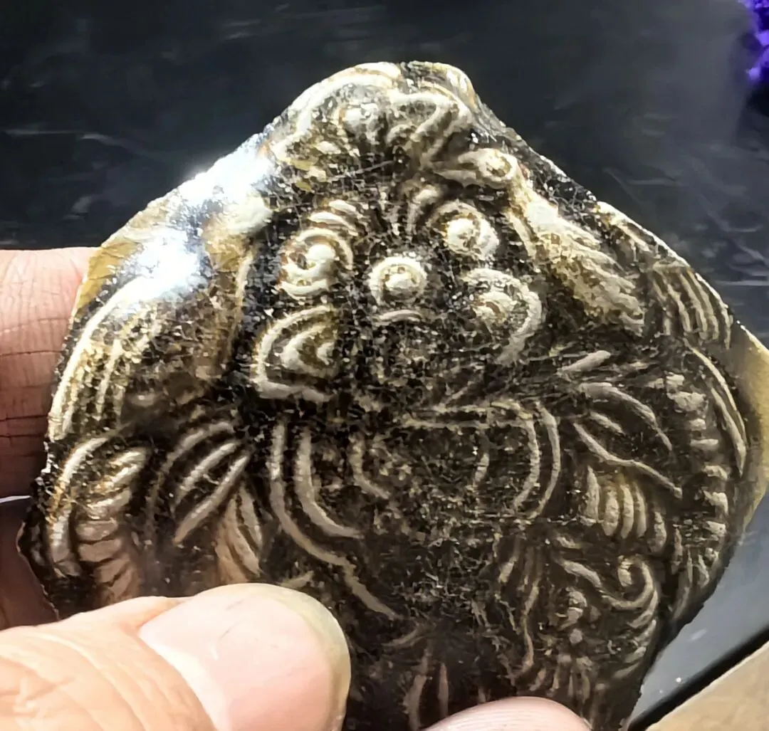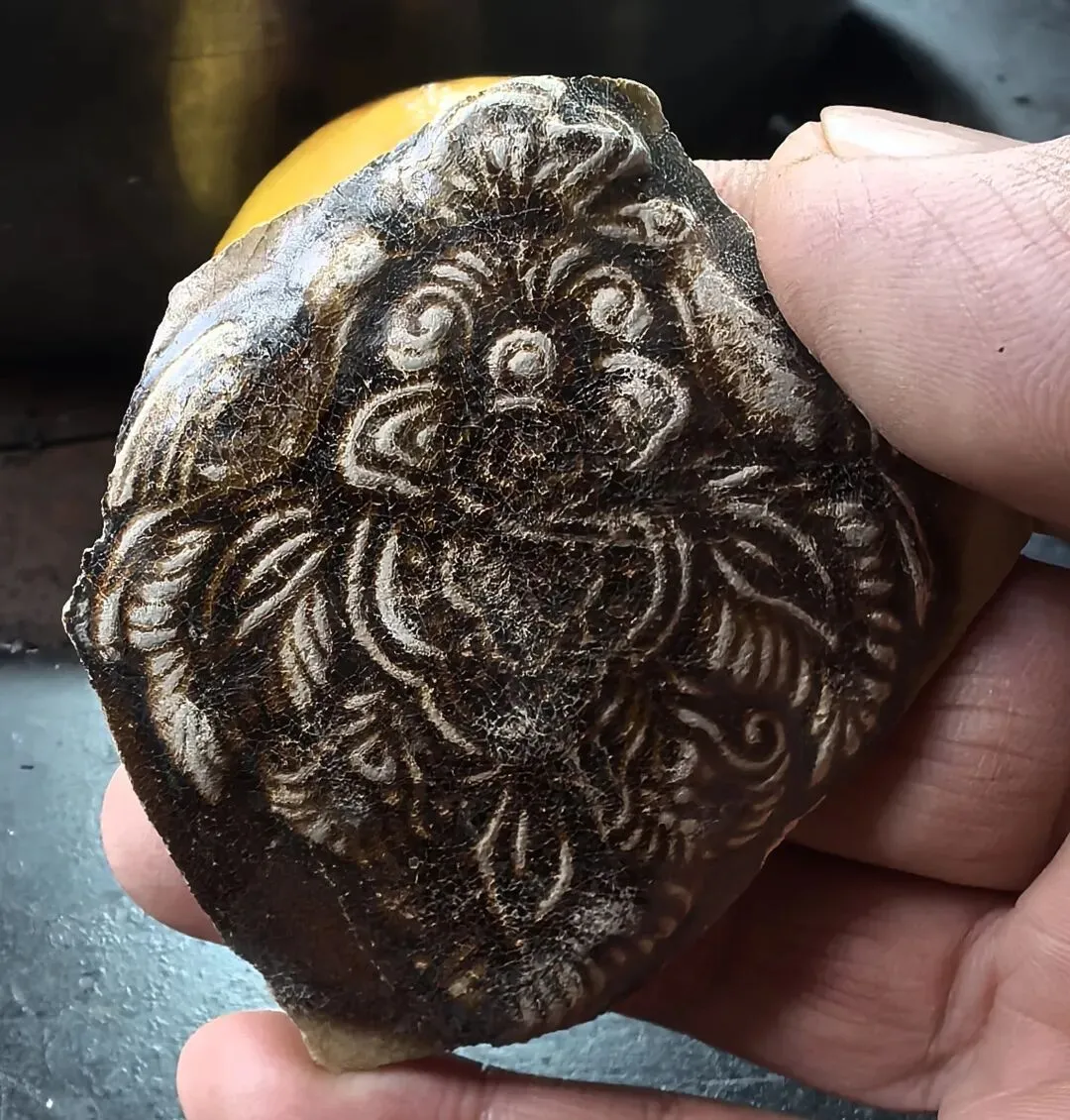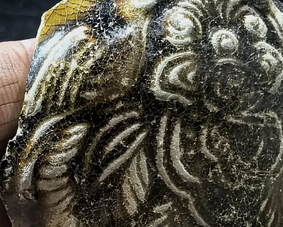 非常有意思,此残片却不似花草纹,更似傩面图腾,怒目圆睁