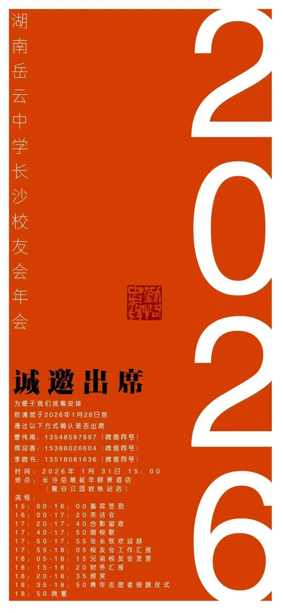 为共叙情谊、凝聚力量、展望未来,我会定于2026年1月31日在长沙岳麓延年颐景酒店(麓谷公园地铁站店)举办校友年会。诚邀您拨冗出席,与师长校友欢聚一堂,重温岁月,共话发展。