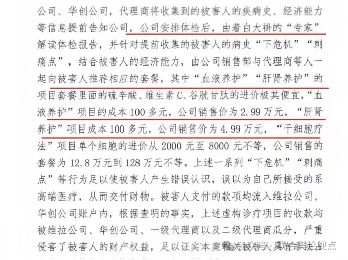 2022年,徐女士被警方告知,其接受服务的江西机构涉嫌医疗诈骗,且该诈骗团伙成员已于2024年被判刑。判决书显示,该团伙以旅游体检为名,诱骗三千余人,涉案金额高达5.3亿元。其中,成本仅百元的维生素C注射液被包装成“干细胞疗法”,售价却高达数万元。例如,“血液养护”项目成本100多元,售价2.99万元;“干细胞疗法”项目单个细胞进价2000元至8000元,售价12.8万元至128万元不等。