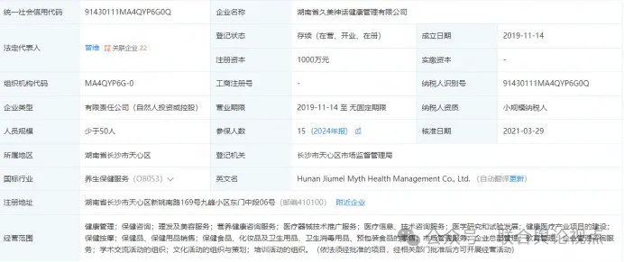 企查查公示系统显示,湖南久美神话健康管理有限公司拥有“久美神话”医药、医疗园艺商标版权,该公司成立于2019年11月14日,法定代表人曾维,刘小玲担任监事职务。