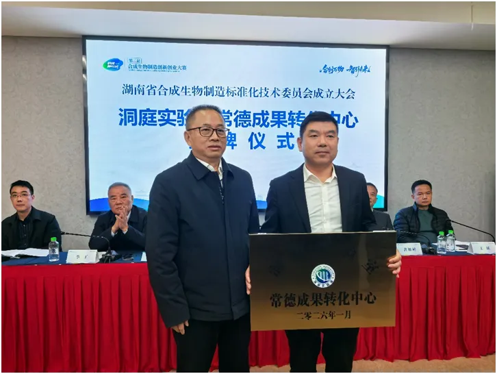 1月16日,在第二届“科创·柳叶湖”合成生物制造创新创业大赛决赛暨颁奖典礼上,常德市人民政府与洞庭实验室联合共建洞庭实验室常德成果转化中心战略合作协议。同日上午,在湖南省合成生物制造标准化技术委员会成立大会上,该中心正式授牌成立。中国工程院院士、洞庭实验室主任单杨出席签约及授牌仪式。