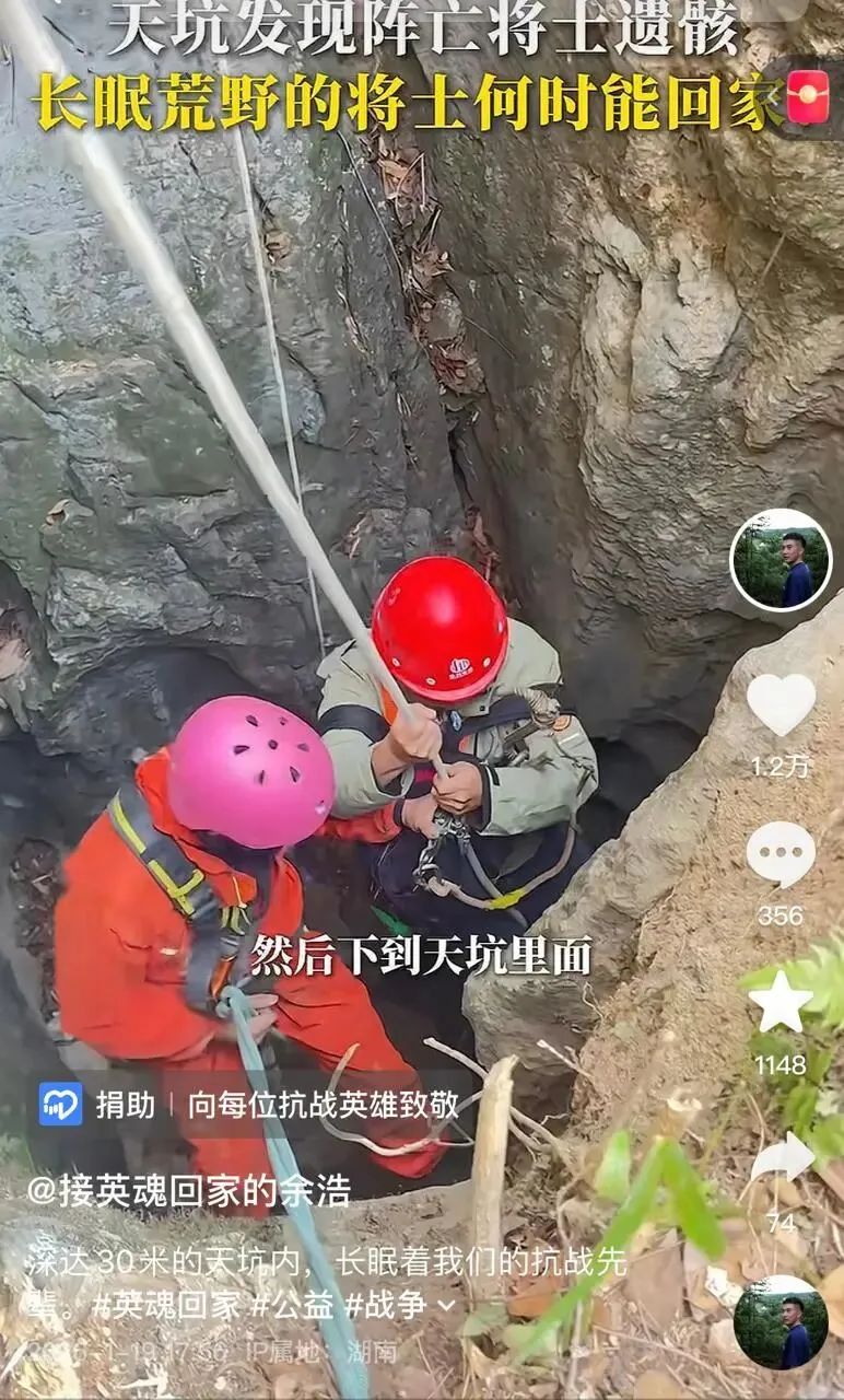 1月19日,公益人“接英魂回家的余浩”在账号发布“30米天坑发现阵亡将士遗骸”视频。据视频内容,在慈利一深达30米的天坑内,发现一具遗骸。据当地四名老人口述,这是一名士兵,“他是一个人跑下来,跑脱了,就掉到这个天坑里去了”。