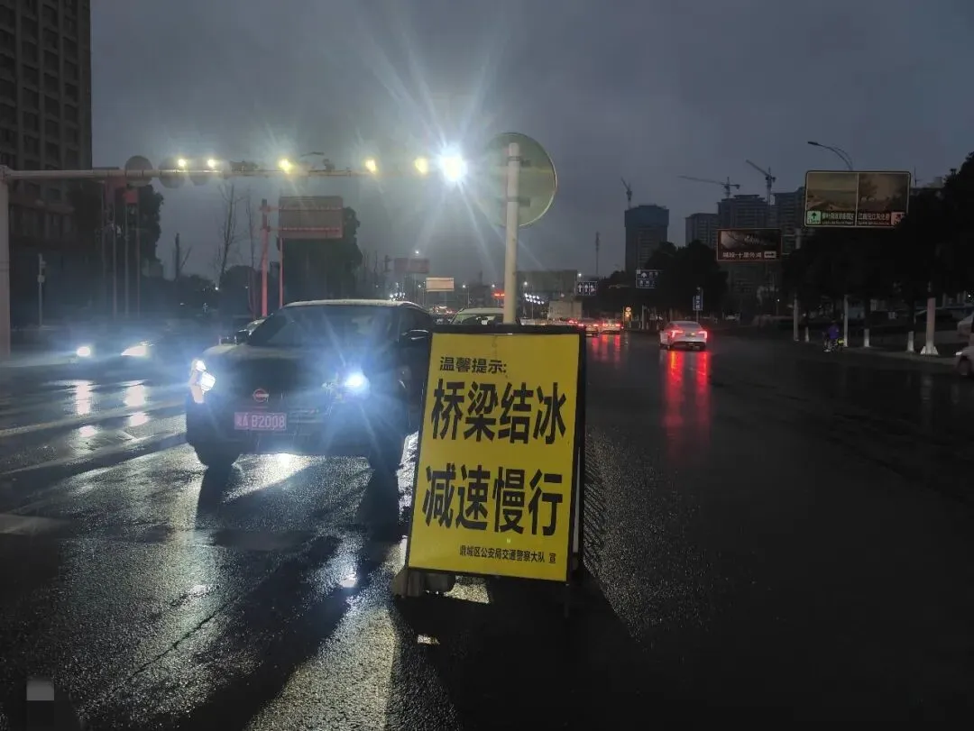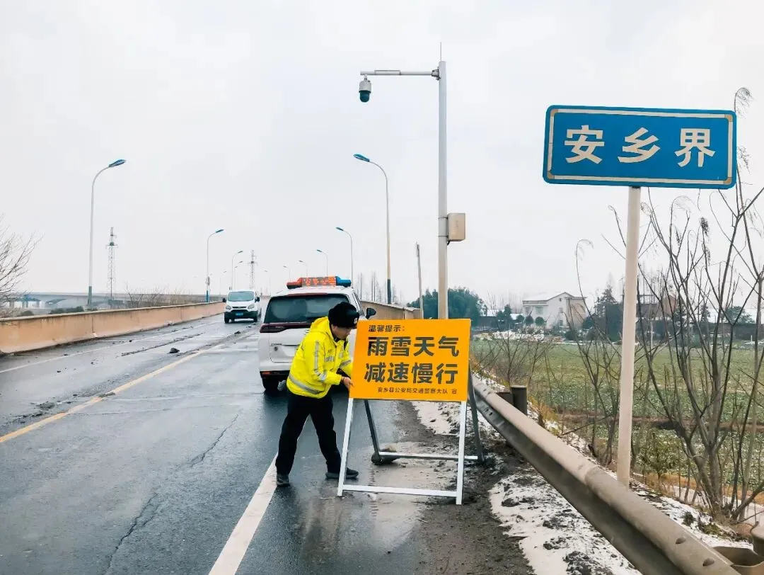 ▲安乡、桃源、鼎城等交管大队针对桥梁、路口等易结冰路段,设置并加固了警示标牌。