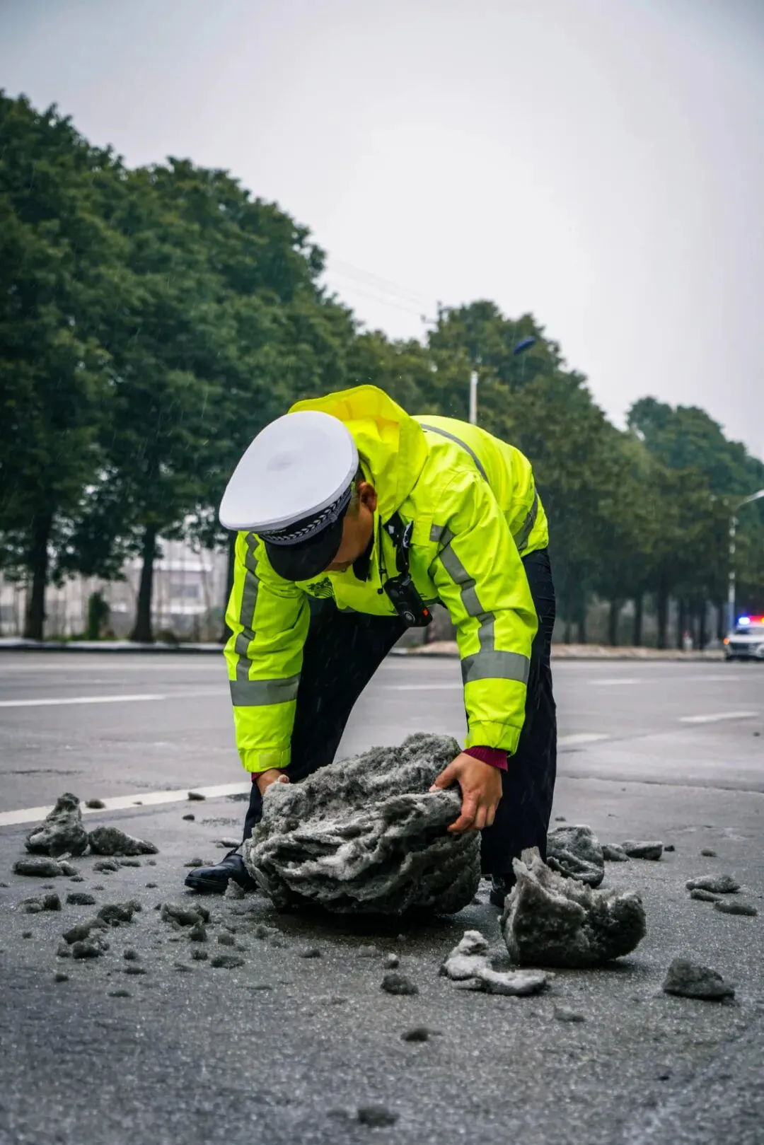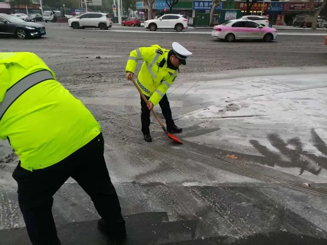 ▲因积雪结冰造成车辆打滑,直属一大队五中队组织警力迅速铲除路口积雪,确保交通畅通。