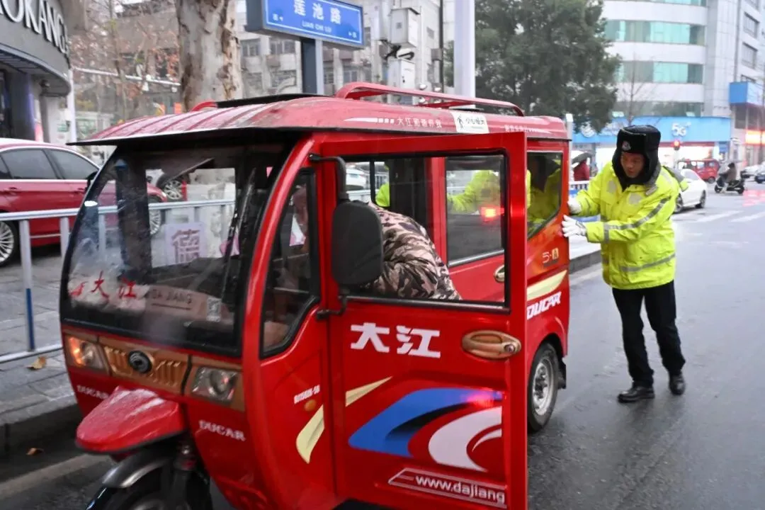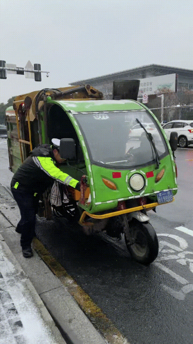 ▲津市大队巡逻发现突发故障停在路边的小车,民警立即设置警示标识疏导车流,用温水融冰、徒手清理的方式,帮车主排除故障。
