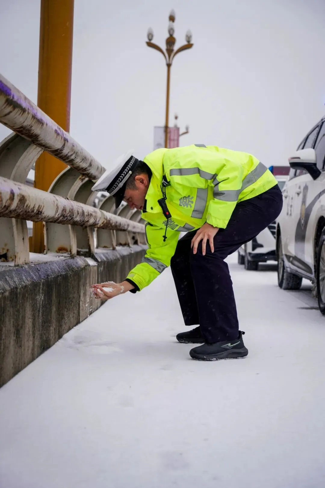 ▲为预防路面结冰,桃源、汉寿、安乡等交管大队在桥梁及其他易结冰路段同步开展了预防性融雪剂撒布作业。