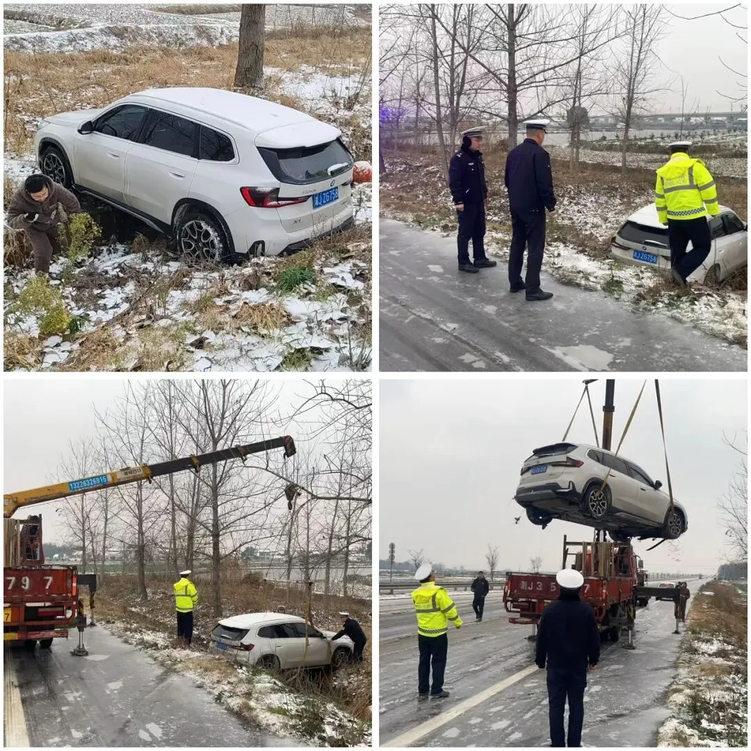 ▲汉寿大队快速响应,调派吊车展开专业救援,帮助雪天路滑侧翻坠入路边沟内的的小车脱困。