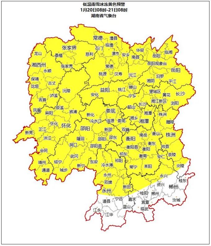 黄色预警区域:长沙、株洲、湘潭、湘西州、张家界、常德、益阳、岳阳、怀化、娄底、邵阳、衡阳、永州中北部、郴州北部。