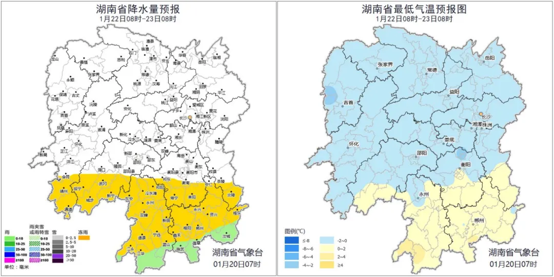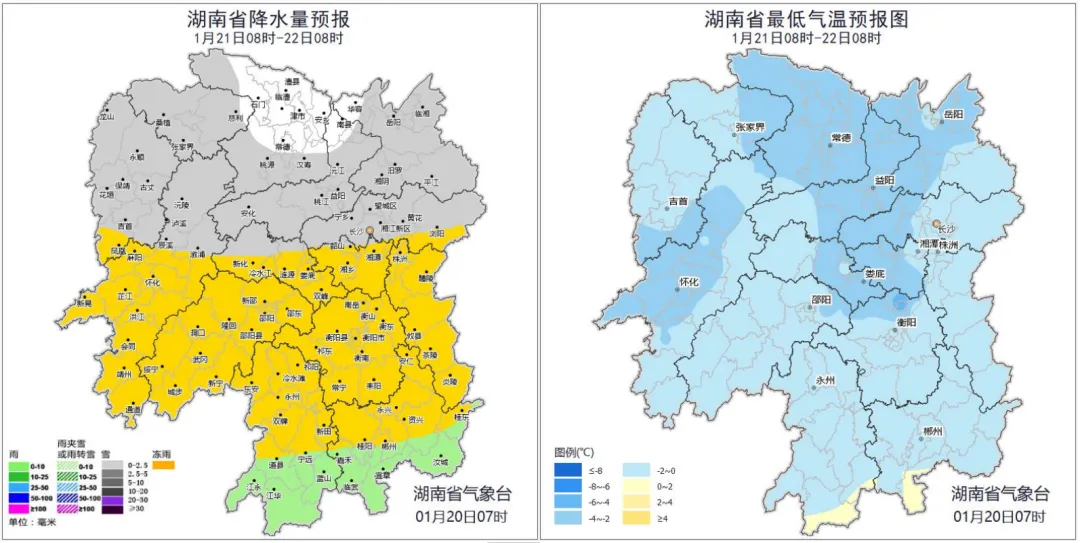 预计20日8时至21日8时,全省大部分地区将出现冻雨、雨夹雪或雪,且最低气温将低于0℃。