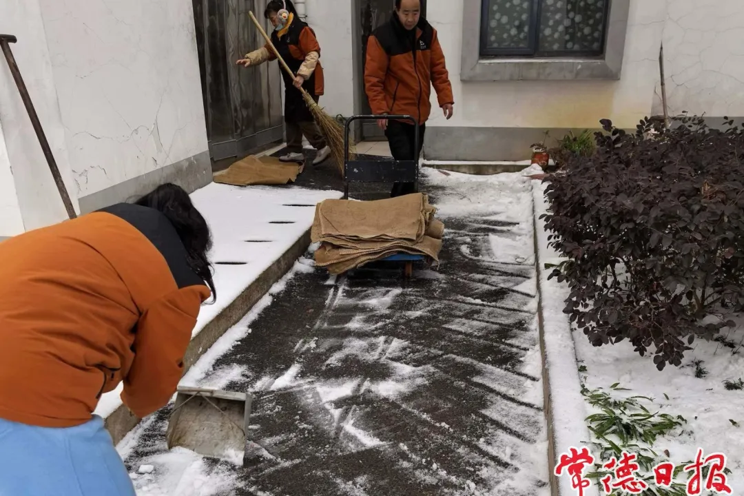 “老人腿脚不便,得赶紧处理干净积雪积冰。”1月20日上午,津市市新洲镇敬老院工作人员手持铁锹、提着盐桶,在院内主干道撒融雪盐、铺纸板防滑。在德山养老院,工作人员全力铲除路面积雪,将安全隐患排查放在首位。结合雨雪冰冻天气特点,各级民政部门还督导各养老机构开展用火用电安全拉网式专项检查,对供暖锅炉、空调等设备逐一“体检”,确保各类设备稳定运行,同时要求养老机构在各出入口、卫生间、走廊等易滑区域,配齐防滑垫、警示标识和扶手,杜绝老年人跌倒等意外伤害。