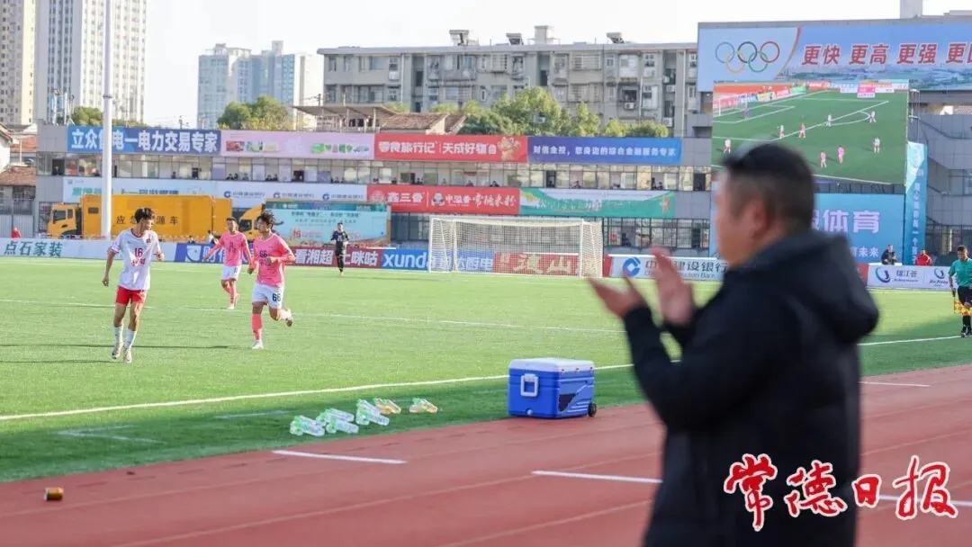 段成功在“湘超”现场为常德队球员加油鼓励。
