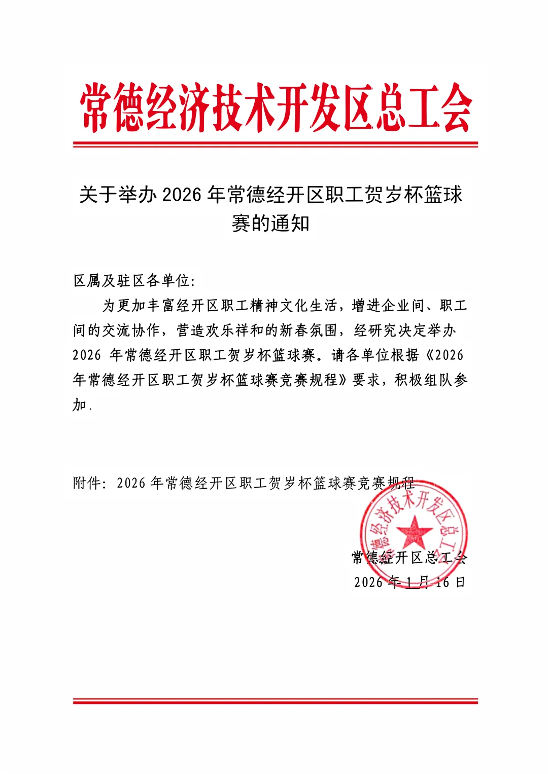关于举办2026年常德经开区职工贺岁杯篮球赛的通知