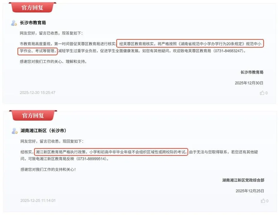 也有家长在“问政湖南”平台咨询芙蓉区和湘江新区期末是否统考,官方回复的是,会严格按照湖南省中小学办学行为规定执行,小学和初高中非毕业年级不会组织区域性或跨校际的考试。