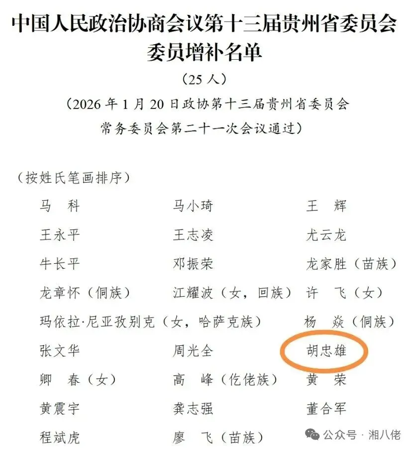 贵州省政协十三届常委会第二十一次会议审议通过了新一批委员增补名单。在增补的25名委员中,现任贵州省委常委、贵阳市委书记胡忠雄的名字格外引人注目。