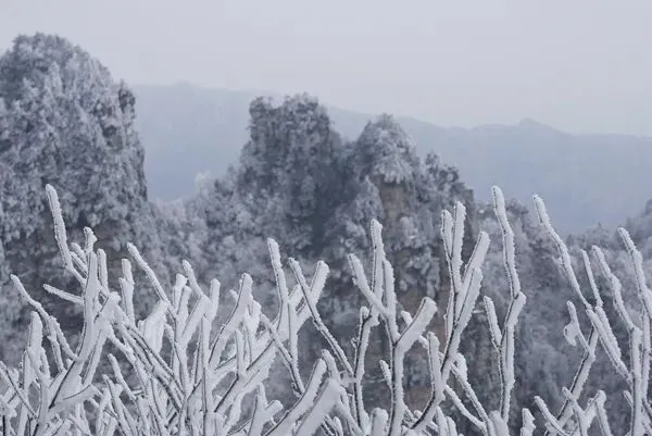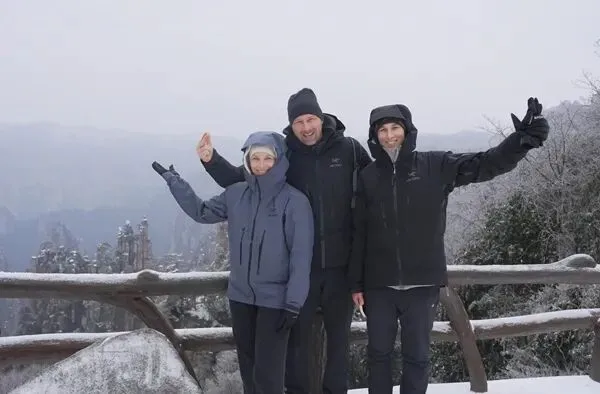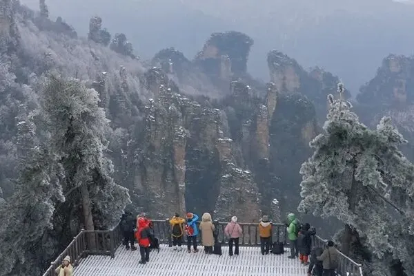在天子山、袁家界等核心区域,挺拔的峰柱被白雪温柔相拥,岩壁上的武陵松缀满了细密的冰棱,形成晶莹剔透的雾凇奇观,尽显冬日灵韵。观景台上,游人纷纷摆出“比心”手势,与这片仙境同框。