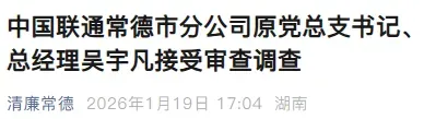 中国联通常德市分公司原党总支书记、总经理吴宇凡涉嫌严重违纪违法,目前正接受中国联通湖南省分公司纪委纪律审查和澧县监委监察调查。