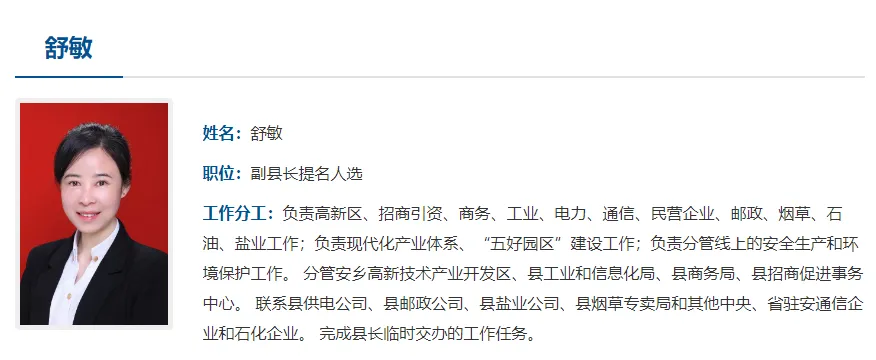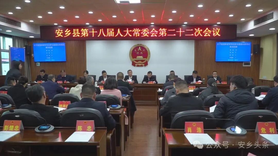 12月17日至18日,安乡县第十八届人大常委会第二十二次会议召开。县委副书记、县长翦鹰出席会议并讲话,县人大常委会党组书记、主任何志祥主持会议,县人大常委会副主任向勇、熊明华、罗志星、蹇在斌、杨成出席会议。县领导黎伟、韩翼飞、王庆全、饶作志列席会议。县直有关单位负责同志,各乡镇人大主席,部分市、县人大代表,三条产业链企业代表及相关工作人员列席会议。本次常委会会议共举行了两次全体会议。第一次全体会议议程由县人大常委会副主任杨成主持。会议听取了部分在安市人大代表履职情况报告。表决通过了有关人事任免事项,决定任命舒敏为县人民政府副县长。舒敏,女,汉族,1977年8月出生,在职研究生,中共党员