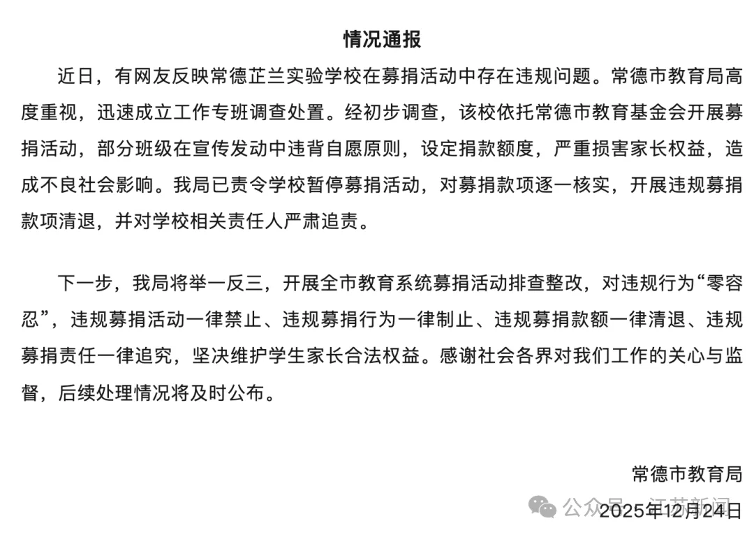 近日,有网友反映常德芷兰实验学校在募捐活动中存在违规问题。常德市教育局高度重视,迅速成立工作专班调查处置。经初步调查,该校依托常德市教育基金会开展募捐活动,部分班级在宣传发动中违背自愿原则,设定捐款额度,严重损害家长权益,造成不良社会影响。我局已责令学校暂停募捐活动,对募捐款项逐一核实,开展违规募捐款项清退,并对学校相关责任人严肃追责。