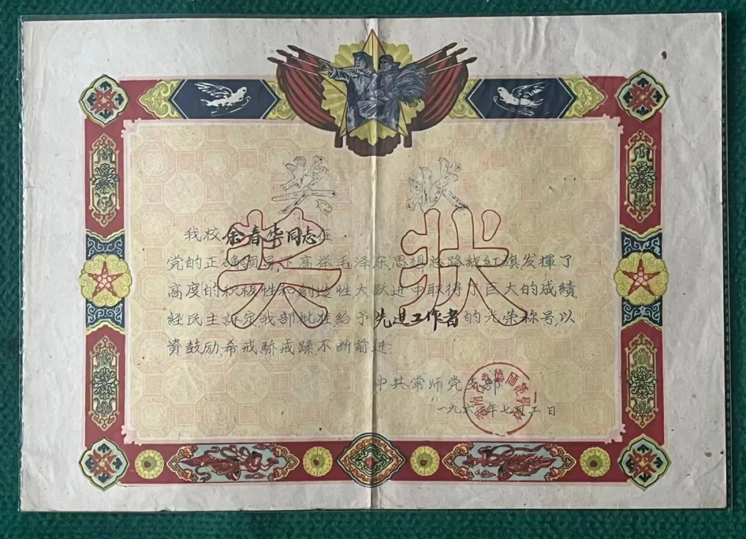 ▲常德师范学校余春华同志荣获1960年先进工作者奖状