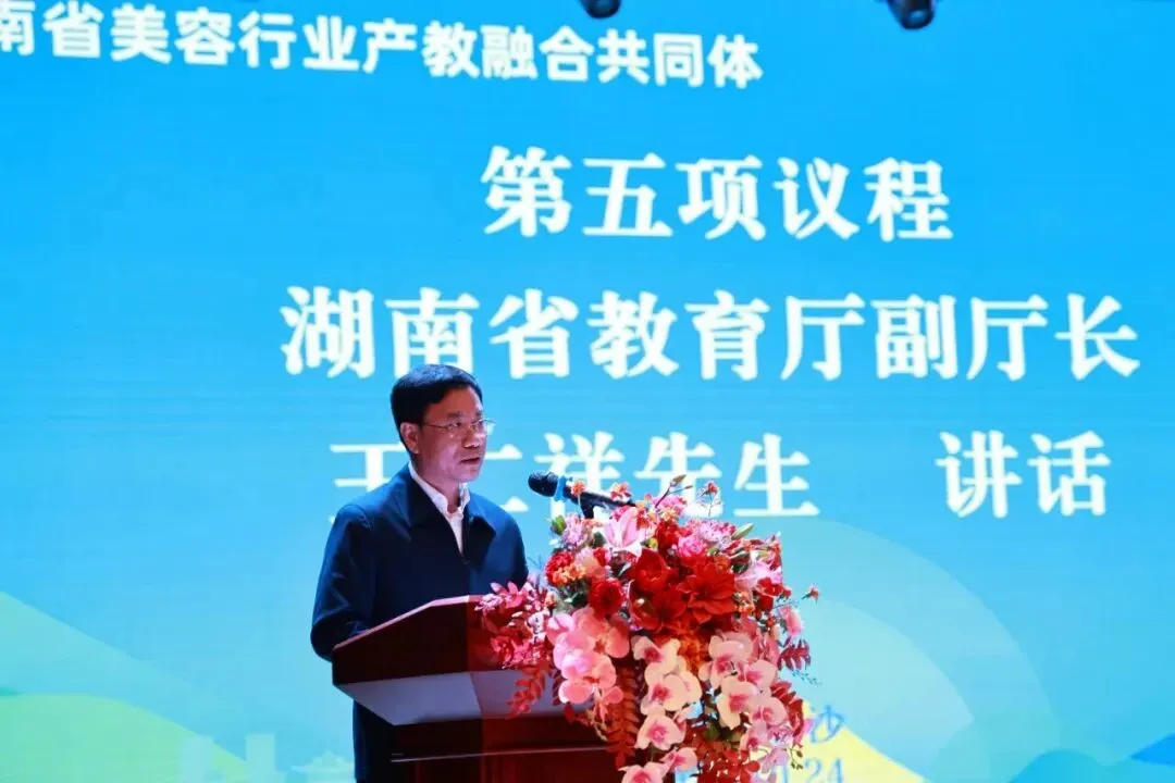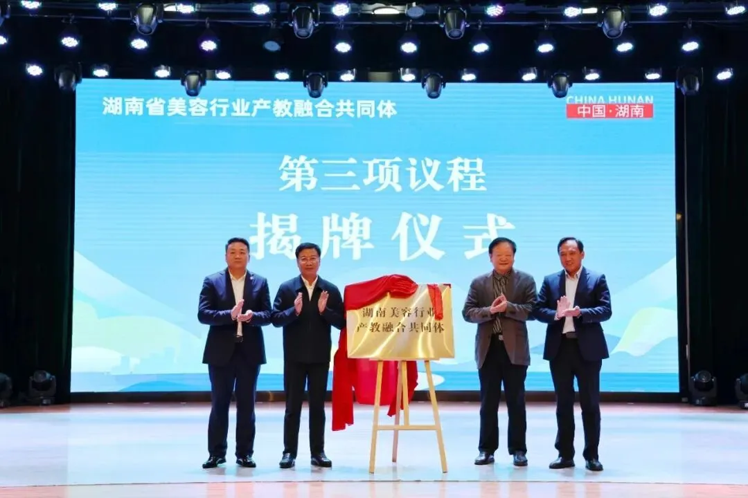 湖南省教育厅副厅长王仁祥(左二),国家教育咨询委员会委员、省人民政府原党组成员、教育顾问、省教育厅原厅长、湖南省民办教育协会会长张放平(右二)共同为湖南省美容行业产教融合