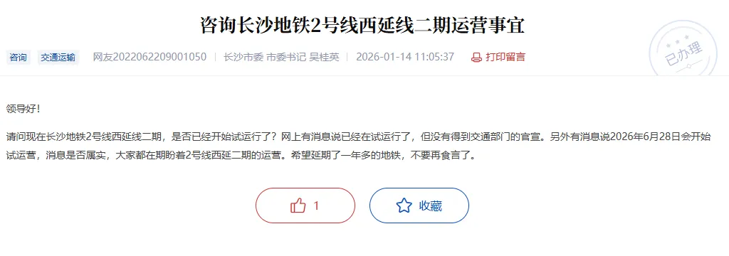 近日,有网友在问政湖南平台咨询地铁2号线西延二期的运营事宜。