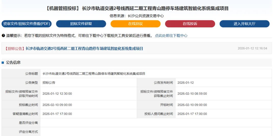 1月12日,长沙公共资源交易中心发布“长沙市轨道交通2号线西延二期工程青山路停车场建筑智能化系统集成项目招标公告”。